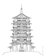 底层的内外二圈柱都包砌在厚达一米的土坯墙内,檐柱外设有回廊,即《营造法式》所谓的“副阶周匝”。而内外柱的排列,又如佛光寺大殿的“金厢斗底槽”。位于各楼层间的平座暗层,在结构上因为增加了柱梁间的斜向支撑,也使塔的刚性有很大改善,经过多次地震,仍安然无恙。