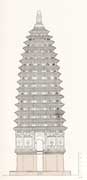 塔平面为十二边形,是我国塔中的孤例。高十五层,40米。底层转角用八角形倚柱,门楣及佛龛上已用圆拱券,但装饰仍有外来风格。密檐出挑都用叠