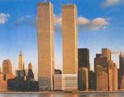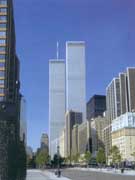 原址位于美国纽约曼哈顿岛西南端,西临哈德逊河,由美籍日裔建筑师雅玛萨基(山崎实)设计,建于1962-1976年。占地6.5公顷,由两座110层(另有6层地下室)高411.5米的塔式摩天楼和4幢办公楼及一座旅馆组成。摩天楼平面为正方形,边长63米,每幢摩天楼面积46.6万平方米。在2001年9月11日的恐怖袭击中坍塌。