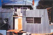 盖里自宅原本是一幢普通的两层荷兰式小住宅,木结构,坡屋顶,位置在两条居住区街道的转角处。盖里大体保留原有房屋,但在东、西、北三面扩建单层披屋。东面扩建部分是一小狭条,成为进入老房子的门厅;西面扩建部分也是一狭条,是老房子的又一门厅,面对内院;北面临街的一边扩充最多,中间一段为厨房,厨房东面为餐厅,西面为日常进食的空间。三面扩建的面积共约74平方米。从所用的材料来看,有瓦楞铁板、铁丝网、木条、粗制木夹板、钢纡玻璃等等,全都裸露在外,不加掩饰。这些添建的部分形体极度不规则,可以说是横七竖八、旁出斜逸;不同材质、不同形状硬撞硬接。最引人注目也是盖里最得意的一笔是厨房天窗的奇特造型。天窗用木条和玻璃做成,好像一个木条钉成的立方体偶然落到凹入的房顶上,不高不低,正好卡在厨房上空。其余的屋顶上安置着若干铁丝网片,支支棱棱,使添建部分的轮廓线益加复杂错乱。所有这些处理同保留下来的老房子的上部,无论在材料上、形体上,还是在风柞、观念上都形成强烈的对比。
