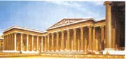 大英博物馆,正立面采用单层的爱奥尼柱廊。18世纪中叶,欧洲人对古昔腊建筑的知识逐渐丰富,在19世纪初,在英国兴起了希腊复兴建筑。原因大致是:第一,当时英国正对拿破仑进行着生死攸关的战争,为了同拿破仑提倡的古罗马帝国建筑风格对抗,一些建筑师转向古希腊。另一方面,当时希腊人民的独立解放斗争引起了欧洲资产阶级先进阶层的同情,因此,希腊复兴在英国形成一股相当有力的潮流,它的主要特点是使用希腊式的多立克和爱奥尼柱式,并且追求体形的单纯。