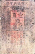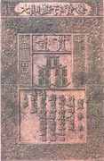 明代在纸币方面的印刷1368年,明太祖朱元璋灭元建明,即皇帝位,改元“洪武”。于洪武七年(1374年)立钞法, 设宝钞提举司,并于宝钞提举司下设抄纸和印钞二局,宝钞、行用二库。从洪武八年 (1375年)起印发纸币“大明通行宝钞”。面额分一百文、二百文、三百文、四百文、五百文、一贯,计六种。币值每贯等于一千文或白银一两,四贯合黄金一两。 明代印发的“大明通行宝钞”为明代发行的唯一货币,其行用贯串明朝始终。为历代印钞史上所独有,是明代印钞事业之一大特点。洪武二十二年(1389年)户部又加发十文至五十文小钞。同时一贯的大明通行宝钞下有“户部奏准印造”字样,当为洪武十三年政府废中书省设户部之后印制。此币票面形式与元币相似,呈竖长方形,高一尺,宽六寸,质青色,周边刻有龙纹花栏。票面上方横书“大明通行宝钞”六个大字;中部为面额“壹贯”文及十串铸钱(十串为一贯),两侧为“大明宝钞、天下通行”八个篆字;下部为竖行楷书“户部奏准印造大明宝钞与制钱通行使用。伪造者斩,造捕者赏银二百五十两,仍给犯人财产。洪武 年 月 日”。票面上盖“宝钞提举司印”两个大方红印。 |