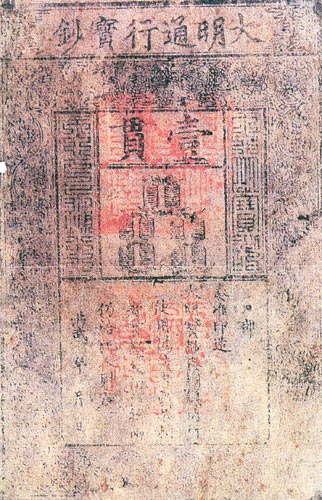 大明通行宝钞一贯下有“户部奏准印造”字样