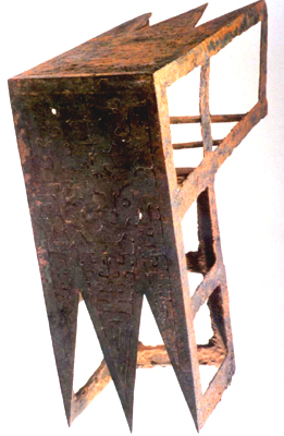 陕西凤翔姚家岗出土。春秋中期。系建筑物梁枋所用饰件,准备露出的两面饰蟠螭纹,一端作尖齿形,一面上有二小钉孔。饰件发现于秦国都雍城遗址窖穴中,纹饰与当时青铜礼器相似。同类饰件以前也发现过,形状各不相同。