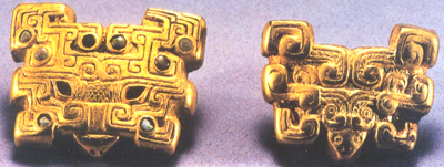 陕西宝鸡益门村出土。春秋后期。略呈方形。正面以蟠螭纹构成兽面纹样。兽鼻下还有三角形兽首。左器兽面双目镂孔,兽面上还有对称分布的八个圆孔。上嵌绿球。器背有一道梁。