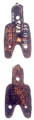 战国赵币。圆肩圆档圆足,其上各有一圆孔,有大小十二型,面记地名“南行唐”,背记重量。大型的是“一两”,小型的是“十二铢”。其背面首端大都铸有炉次或范次的数字。币文“南行唐”即“南行汤”。汉代属常山郡,今河北行唐县附近,战国赵地。