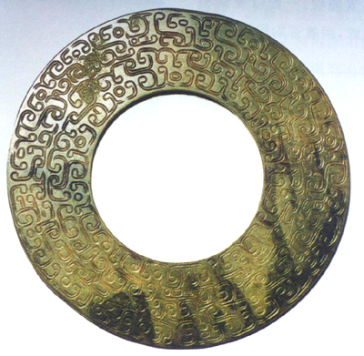 河南光山黄君孟墓出土。春秋。青色。体扁平,圆环形,中心有一大圆孔。一面光素,一面以双钩饰细密变形并兼装饰图案的鸟纹。