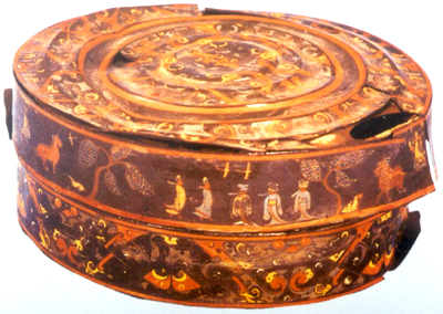 湖北荆门包山出土。战国晚期。奁为圆盒形,直壁、平底,夹纻胎。整器由盖、身两部分组成,子母口扣合。内壁髹红漆,外壁髹黑漆之后又以红黄、蓝等色漆彩绘。盖顶绘两组凤鸟纹图案。盖壁绘一幅出行图。整幅画面由二十六个人物、两辆骖乘、两辆骈车、九只大雁、两只狗、一只猪和五棵大树构成。腹壁绘几何形云纹图案。腹底外围绘一组以连续“Y”形为主,内填云纹的图案。各组彩绘交相辉映,使漆奁显得既光彩夺目,又曲雅庄重。尤为难得的是盖壁上的出行图,构图紧密,布局合理,画法生动,堪称战国漆画中的瑰宝。