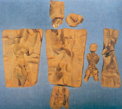 山西侯马铸铜遗址出土。一套完整范,发现时已合好待铸。复合范,由六扇范组成,足底一扇兼作浇口。铸件为一人跪坐,面朝右侧,两手向斜上方作捧物状。披发,上身似赤膊,饰蛇螭类纹饰,很似纹身。腕部似有镯类饰物。腰部系带,前面打结。背斜插短剑,剑鞘中部附有一长方形“玉具”,系于腰带上。下身着裤或裙,长仅及膝,饰雷纹衬底的勾连T形纹。鞋侧饰云纹图案,鞋底面呈方格状。综观该人形当属“断发纹身”的南方异族形象。