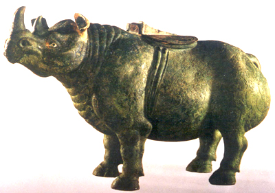 陕西兴平豆马村出土。战国中晚期。通体作犀牛形。首有两角,小目,颈及前腹有褶襞。背上有盖,可揭启。口侧设管状流。全身饰云气纹,错金银丝。造型栩栩如生,制作精细,从出土地点看当为秦人杰作。