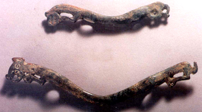 河北怀来甘子堡出土。春秋晚期至战国早期。镳一为蹲踞状豹形,中间略弧。一端作成豹的前半身,豹首面向一侧,前肢屈曲前伸与下颌相连,另一端作成豹的后半身,后肢屈曲前伸,尾下垂。豹前、后身侧面,各铸一椭圆形穿孔。另一为蹲踞状的兽形,中间向下弯。前端铸一兽首,张口,卷鼻,睁大眼,尖耳向前,前肢前屈,另一端后肢亦前屈,短尾上卷。肩和后身铸圆形孔。