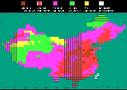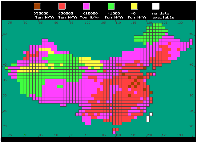 1°网格排放图。有趣地是,该图与前面的SOx和NOx图规律有所不同:农村NH3的排放高于某些城市;西部农牧区NH3的排放,并不比东南部低多少。