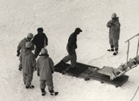 早晨九点许,广播里突然传来"はちじゅらさり……"的呼声,这声音一般是指舰载的83号直升飞机有行动。因为,每当白濑号靠岸,直升飞机运载飞行时,往往可以听到这样的广播声,意即"83号返航"或"83号起飞"。我纳闷:白濑号正在航行中,直升飞机怎么会起飞呢?我穿上外衣,上了甲板的左舷,但见甲板四周的栏杆并未放下,表明直升飞机不会起飞。我脑海里闪着这个疑问向停机场走去。舰长佐藤正好和我相遇。我们相互问好后,我说:"I