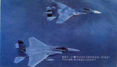 美F—15“鹰”式歼击机位前素米格—29“支点”歼击机领航