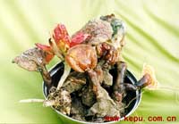 今天,似乎运气很好。当我们扛着蘑菇往回走时,在离大本营约一公里处我们照样边走边寻找,目的是想再发现蘑菇。突然,似乎是一棵灵芝闯如我的视线。我立即停下,一手从土中拔了出来,用力过猛,还带着一棵小石头。我举起灵芝,向文敬他们喊:“灵芝!”距我最近的文敬一下扑过来,就在我刚采摘的地方乱摸,仿佛要把灵芝从土地里拔出来一样。我用目光仔细往后一看,又有几棵灵芝呈现在我的眼前,我转身往后,并高兴地说:“在那儿!”文敬和小周闻声过来,大家一起争着采摘、找寻,一共找到七棵,分而享之。