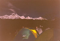 昨晚,晴空之夜,真是老天爷对我们穿越大峡谷成功的庆功夜。这明月夜来之不易啊!记得11月23 日以来,大本营几乎每晚都有小雨,阴云的天空已经持续了10多个晚上,它仿佛寓意着我们穿越过程正经历着困难重重的境地一样,没有过一个明月夜!从12月3日到胜利会师起,天转晴,12月3日晚又是一个明月夜。队员们燃起篝火,在月光下谈天说笑,民工们夹在队员中不时传出欢乐的门巴族民歌来。真是,欢声笑语伴明月,月影树下篝火明。