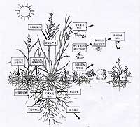 从图可以看出,草原生态系统的生产者不是高大的乔木,而是禾本科、菊科植物为主的草本植物,其地上部分现存量较低,而地下部分有发达的根系,且以细根为主。地下部分现存量是地上部分现存量的5倍以上。草原生态系统的消费者在野生动物中以啮齿动物为主,草原是啮齿动物的天堂。而分解者以真菌、细菌、放线菌为主。草原生态系统的非生物环境也很具特色,一般降水量较低,在我国都低于450毫米。草原生态系统不仅是重要的畜牧业生产基地,而且是重要的生态屏障。