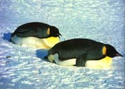 企鹅不会飞,善游泳。在陆上行走时,行动笨拙,脚掌着地,身体直立,依靠尾巴和翅膀维持平衡。遇到紧急情况时,能够迅速卧倒,舒展两翅,在冰雪上匍匐前进;有时还可在冰雪的悬崖、斜坡上,以尾和翅掌握方向,迅速滑行。企鹅游泳的速度十分惊人,成体企鹅的游泳时速为20~30公里,比万吨巨轮的速度还要快,甚至可以超过速度最快的捕鲸船。企鹅跳水的本领可与世界跳水冠军相媲美,它能跳出水面2米多高,并能从冰山或冰上腾空而起,跃入水中,潜入水底。因此,企鹅称得起游泳健将,跳水和潜水能手。