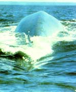 蓝 鲸 蓝鲸(张坤诚摄) 又叫长箦鲸,体长30米,平均体重150吨,最大者190吨。它的一只舌头就有3~4吨,足以装满一辆解放牌大卡车。它的躯体呈蓝灰色或黄褐色,这是由于它的皮肤上覆盖着一层黄褐色硅藻膜的缘故,其实,它的真正颜色是黑色。蓝鲸的躯体庞大而肥胖,是首当其冲的捕杀对象之一,因此,其数量不断下降,现存量仅20万头。 蓝鲸 鳍鲸 巨臂鲸 缟臂鲸 露脊鲸 抹香鲸 逆戟鲸 [上一页] [下一页]