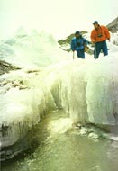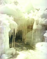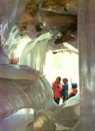 冰川上的融水,在流动过程中,往往形成树枝状的小河网,时而曲折蜿流,时而潜人冰内。在一些融水多面积大的冰川上,冰内河流特别发育。当冰内河流从冰舌末端流出时,往往冲蚀成幽深的冰洞。洞口好象一个或低或高的古城拱门。从冰洞里流出来的水,因为带有悬浮的泥距沙,象乳汁一样浊白,冰川学上叫冰川乳。当冰川断流的时侯,走进冰洞,犹如进入一个水晶宫殿。有些冰川,通过冰洞里的隧道,一直可以走到冰川底部去。冰洞有单式的,有树枝状的,洞内有洞。洞中冰柱林立,冰钟乳悬连,洞璧的花纹十分美丽。有的冰洞出口高悬在冰崖上,形成十分壮观的冰水瀑布。