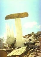 冰蘑菇 冰蘑菇 冰川周围嶙峋的角峰,经常不断地崩落下岩屑碎块。如果崩落的岩块较小,在阳光下受热增温就会促进融化,结果岩块陷人冰中,形成圆筒状的冰杯,进而形成冰面湖。如果较大体积的岩块覆盖在冰川上,引起差别消融,当周围的冰全部融化了,而大石块因为遮住了太阳辐射,其下的冰没有融化,就能生长成大小不等的冰蘑菇。 [上一页]
