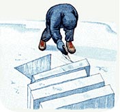选取较干的,硬度较大的雪作为材料,用长刀或雪铲将雪切成砖状。砖块的大小一般为:长1米,宽40厘米,高20厘米。
