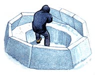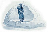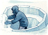 建造雪屋,除了长刀一把,不需要任何工具。最适合于建筑雪屋的积雪,是那些经过暴风雪吹打而变得很密实的雪。用切西瓜那样的长刀,把积雪切成一块一块较大的雪砖,使雪砖互相挨紧,砖缝之间抹上一层碎雪作为灰浆。