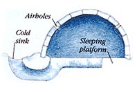 建墙的时候,只需将雪砖一层层砌起即可,水泥用碎雪代替。建墙时要注意慢慢向里收拢,只有这样雪屋才能封住顶。盖房子当然要有门,门留在哪呢?门不是留在墙上,而是在墙的下面挖一个隧道,这样做有点像鼹鼠,不过它的好处就是能防止冷空气直接进入。在靠墙的另一边用雪砖建一个平台,干什么用?当然是用来睡觉了。这可是武侠小说里武林人士梦寐以求的冰床啊。