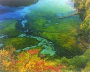 ¡¡¡¡Îå²Ê³ØºÍÎ廨º£ÊǾÅÕ¯¹µº£×ÓÖеľ«´â¡£º£³ØÖÐÉú³¤×ÅË®Ãà¡¢ÂÖÔ塢ˮާµÈ£¬ËÀÍöºó´óÁ¿¶Ñ»ýÓÚºþµ×£¬·´ÉäºþÃæ³ÊÏÖ³ö»Æ¡¢ÂÌ¡¢À¶µÈÎå²ÊÎ廨¡£