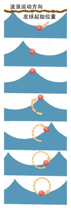 现在再回到海里的皮球。如果注意观察就会发现,皮球在水中只随着波浪上下颠簸和左右摇摆(见图0125.4.1)。当波峰传过来的时候,皮球被向上举起来,还随着波浪向前移动了一点距离;在波谷到来时,皮球被抛下来,还向后回到了原来的位置。这样的结果,-个波传过去了,也就是说波形向前移动了,而皮球还在原地没有前进,只是随着波动做了一个圆周运动。
