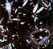 海洋鱼类及各种海洋动物都是以飘浮在海水中的微小的植物和动物--浮游生物为食物的,就像我们人类是以农业生产的粮食和畜牧业生产的家畜为食物一样。海洋浮游生物是海洋生物的重要组成部分,它们数量庞大、种类繁多,可以分为海洋浮游动物和海洋浮游植物。它们能够随着波浪和海流一起移动。海洋浮游植物是自养生物,主要包括海洋细菌和一些单细胞藻类,它们可以自己制造有机物,主要是碳水化合物和氧气。正是由于它们的存在,其他生物才能够生存,它们是海洋食物链中重要的一环。