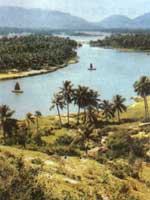 (左图)万泉河发源于五指山林北村南岭,在博鳖港入海,全长162公里,流域面积3683平方公里.照片为万泉河下游河面。