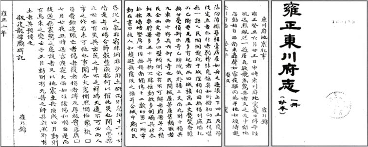 东川府地震记事 清雍正十三年(1735)崔乃镛 东川府地震记事 雍正十一年六月二十三日云南东川府(今云南会泽西南)发生7 3/4级地震。东川府知府崔乃镛(陕西同官人,雍正九年到任)对这次地震作了祥细记载。 《东川府地震记事》全文
