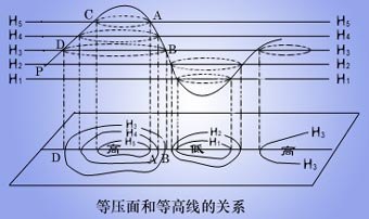 等高线和等压面 等高线和等压面图空间气压场的情况一般用等压面图表示。在空间的每一点都有一个气压值,如果把所有气压相同的点连接起来,就形成一个等压面。由于同一高度上各地的气压不等,气压在空间的分布,就象山丘一样起伏不平。在同一高度上,气压比四周高的地方,等压面上凸,而且气愈高的地方等压面上凸的愈厉害;气压比周围低的地方,等压面上凹,而且气压愈低,等压面下凹的愈厉害。因此,等压面的起伏形势和该面附近等高面上气压的分布形势相对应。