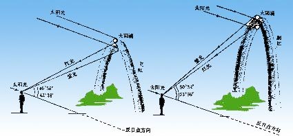 虹和霓都要背对太阳而立才能观察到。在夏日的傍晚,西方放晴而东方天空有云 雨时,最易看到虹和霓。当太阳光平行地照射到水滴上时,经历折射反射后的出射光中,多数比较暗淡,只有偏离阳光原入射方向的角度为最小(即最小偏向角)的出射光束,显得特别明亮。若在与太阳相对的另一半天空中的水滴,被阳光照射,在雨滴中经两次折射、一次内反射而以最小偏向角出射的光,恰好投射到背太阳而立的观测者眼帘,看到的弧形光环便是虹。阳光七种色光的最小偏向角稍不同,平均约为138度。若阳光在雨滴中经两次折射,两次内反射而以最小偏向角出射的光,恰好投射到背阳而立的人眼中,看到的弧形环便是霓,阳光七种色光的最小偏向角亦稍异,平均约232度。