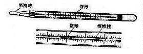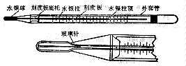 感应部分是一个充满液体的玻璃球或柱,与感应部分相连的示度部分是一端封闭、粗细均匀的玻璃毛细管,测温液体通常用水银、酒精或甲苯等。由于玻璃球内液体的热胀系数远大于玻璃,毛细管中的液柱会随温度变化而升降。常用的玻璃温度计有最高温度表,最低温度表和干湿球温度表。