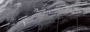 表现为左界光滑整齐,与急流轴平行的卷云区。急流呈反气旋弯曲时,云系稠密,急流呈气旋性弯曲处云系稀少或无云。急流云系可以分为宽阔盾状卷云区,卷云线和横向波动云系三种。
