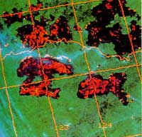 草原和森林火灾的监测 草原或森林发生火灾的地区,温度远高于周围地区。采用3.7μm波段,对高温区特别敏感,利用3.7μm可以监测林区和草原发生的火灾。 红色部分表示内蒙古地区林区及草原火灾图象 [上一页] [下一页]