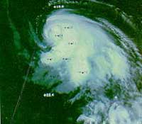 在卫星云图上,台风由台风眼、中心稠密云区和螺旋云带组成。台风眼分成大眼、小眼、圆眼和不规则形状眼,它可以位于台风云区中心,也可位于台风云区边缘。中心稠密云区边界越光滑,云型越圆,尺度越大,越稠密,台风强度越大。台风云带越宽,环绕台风中心的圈数越多,强度越大。与台风相联的另一种云带称对流带。