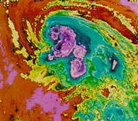 台风云系 在卫星云图上,台风由台风眼、中心稠密云区和螺旋云带组成。台风眼分成大眼、小眼、圆眼和不规则形状眼,它可以位于台风云区中心,也可位于台风云区边缘。中心稠密云区边界越光滑,云型越圆,尺度越大,越稠密,台风强度越大。台风云带越宽,环绕台风中心的圈数越多,强度越大。与台风相联的另一种云带称对流带。 台风云系图 台风云系彩色分层显示图 [上一页] [下一页]