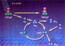 CCl2F+Cl¡£Õâ¸öÊͷųöµÄÂÈÔ×Ó£¬ÓÃÊý¸öÔµÄʱ¼äͨ¹ý´ß»¯·´Ó¦£¬¾Í¿ÉÒÔʹ10Íò¸ö³ôÑõ·Ö×ÓÏûʧ¡£Ê×ÏÈ£¬ÂÈÓë³ôÑõ·´Ó¦£¬Éú³ÉÑõ»¯ÂÈ×ÔÓÉ»ù£ºCl+O3
