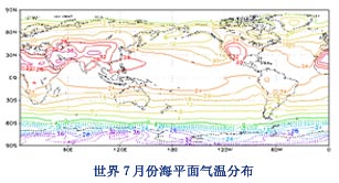 从7月份海平面气温分布图上可以看出,7月世界的气温分布具有以下的特点: