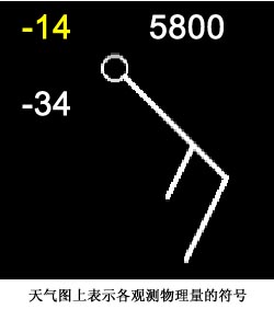 下图为天气图上表示某个台站各物理量的符号,其中的用黄色加亮的符号表示某时刻测到的该台站的地面气温数值。需要注意得是,这里温度的单位是摄氏温标。如该例中的温度值为-14℃。