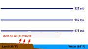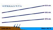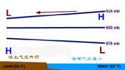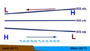 夜间,情况变得恰恰相反:陆地上,空气很快冷却,气压升高;海面降温比较迟缓(同时深处较温暖的海水和表面降温之后的海水可以交流混合),因此比起陆面来仍要温暖得多,这时海面是相对的低气压区。但到一定高度之后,海面气压又高于陆地。因此,在下层的空气从陆地流向海上,在上层的空气便从海上流向陆地。在这种情况下,整个垂直环流的流动方向,也变得和前面海风里的垂直环流完全相反了。在这个完整的垂直环流的下层,从陆地流向海洋,方向大致垂直海岸的气流,便是陆风。上图给出了陆风形成的过程。