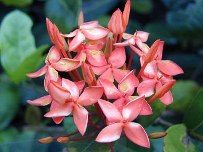 龙船花又名山丹,为茜草科常绿小灌木,花期夏、秋季,常开不败,花瓣细小,状如瓜子壳,但数量众多,常常成簇成群地聚生于枝条之上,且颜色鲜红,似一团团熊熊燃烧的火焰。虽然龙船花植株矮小,但它的花和叶都很漂亮,所以特别适宜庭园栽植观赏,也可用于灌丛、林下或道路边缘布置。