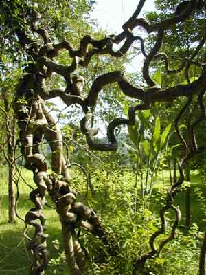 使人惊奇的是,有粗如臂腿的巨藤,它们从地面斜飞上二三十米高的大树,有的粗大藤条悬挂在高大树冠的下面,有的还自己缠绕,成垂吊的大小不同的环结。偶尔还可见到猕猴(Macaca mulatta mulatta)或懒猴(Nycticebus coucany bengalensis)在上面打秋千,悠闲自在。人们对它们如何攀爬上去,总是久思而不解。经过仔细观察才发现,原来它们的生长和攀爬还是顺序渐进,而不是好高骛远的。它们起初是爬上小树、再渐次往中、上层树木过渡。在这个过程中,遇到有被攀附的树木死亡,它们便随死亡、倒地的树木回到地面或下层的树木。下落的藤子又顽强继续生长,踏上了新的攀爬征程,反复多次,便形成了上述的多姿而壮丽的景观。