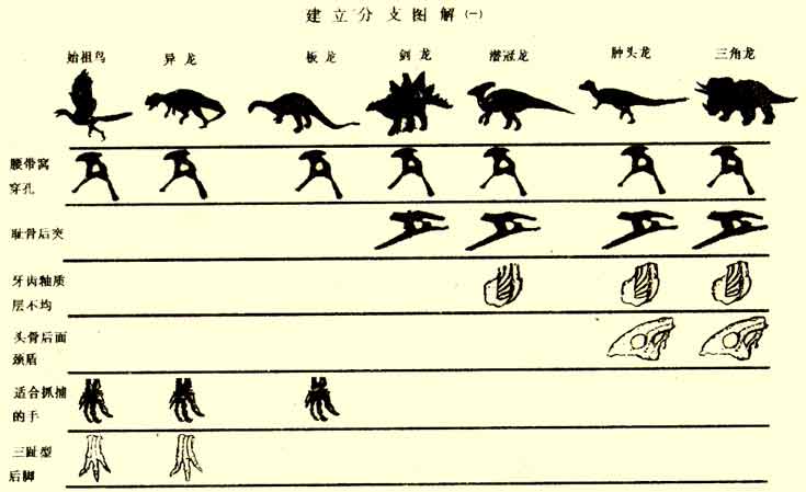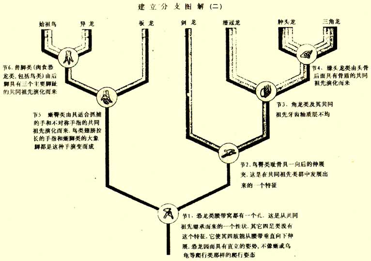 ¡¡¡¡ÎªÁ˼ò±ãÒ×¶®£¬ÕâÀïµÄÕâ¸ö·Ö֧ͼֻ¸ø³ö6¸öÐÔ×´¡£ÔÚʵ¼ÊµÄ¿ÆÑ§Ñо¿ÖУ¬¿ÆÑ§¼ÒÃÇÈ´ÍùÍùÒªÓÃ20µ½100¸öÐÔ×´À´Ì½ÌÖÉúÎïÖ®¼äµÄÇ×Ôµ¹ØÏµ¡£ ¡¡¡¡Í¨¹ý¶Ô¹Ç÷ÀµÄ×Ðϸ±È½Ï²¢½«ÐÔ×´·Ö²¼ÁгÉͼ±í£¬¾Í¿ÉÒÔÕÒ³öÖØ¸´ÐγÉͬһÀàȺµÄÐÔ×´ÐÎʽ¡£¶Ô´óÁ¿µÄÊý¾Ý±ØÐëÓüÆËã»ú³ÌÐòÀ´´¦Àí¡£ÔÚÿ´ÎÑо¿ÖУ¬ÐÔ×´·Ö²¼·¢ÉúµÄÿһ´ÎµÖ´¥¶¼ÐèÒªÑо¿ÕßÖØÐ¼ì²é±ê±¾£¬²¢ÉóÊÓÖîÈç±ê±¾±£´æÊÇ·ñ×ã¹»ÍêºÃ¡¢ÐÔ×´ÊÇÕæÕýµÄÏàͬ»¹ÊÇ¡°Ã²ºÏÉñÀ롱µÈµÈÎÊÌ⡣Ȼºó£¬ÔÚ·Ö֧ͼÖÐÐÎÏ󵨽«Ç×Ôµ¹ØÏµÏµÍ³Ãè»æ³öÀ´¡£ÓÉ×î´óÁ¿µÄÐÐ×´Ö§³ÖµÄ·Ö֧ͼ±»Ñ¡¶¨Îª×î¼Ñ·Ö֧ͼ£¬µ«ÊÇËüÒ²Ö»²»¹ýÊÇ×÷Ϊ½øÒ»²½Ñо¿µÄ»ù´¡£¬¶ø²»ÊÇ×÷ΪÖÕ²»¸Ä±äµÄ×îºó½áÂÛ¡£¿ÆÑ§ÊÇÎÞÖ¹¾³µÄ£¬ÐÂÀíÂÛµÄÌá³öÍùÍùʹÐí¶à¾ÉµÄÀíÂÛ±»ÌÔÌ£¬Í¬Ê±Ò»Ð©¹ýÈ¥²»±»ÖØÊӵļÙ˵»á±»ÖØÐ²ÉÄÉ£¬µ«ÊÇËùÓÐÕâЩ¹ý³Ì¶¼Òª¾ÊÜ¿ÆÑ§ºÍʵ¼ùµÄ¼ìÑé¡£¾ÍÁ¬ÃÀ¹ú×ÔÈ»ÀúÊ·²©Îï¹ÝÖÐÕ¹³öµÄ·Ö֧ϵͳͼҲ¿ÉÄܽö½öÊÇÔÝʱµÄ×î¼Ñ·Ö֧ϵͳͼ¡£ ¡¡¡¡ÔÚ·Ö֧ϵͳѧ·ÖÎöÖУ¬ÄÇЩȷ¶¨½Ï´óÀàȺµÄÌØÕ÷ÓÉÓÚ±»ÈÏΪ³öÏÖ½ÏÔç¶ø±»³ÉΪÔÊ¼ÌØÕ÷£¬¶ø½ÏСÀàȺËù¹²ÓеÄÌØÕ÷ÓÉÓÚ³öÏÖ½ÏÍí¶ø±»³ÆÎª½ø²½ÌØÕ÷»òÑÜÉúÌØÕ÷¡£²ÉÓÃÕâÖÖ·½·¨Ê±£¬ËùνÔʼºÍ½ø²½µÄ¸ÅÄî¶¼ÊÇÏà¶ÔµÄ£¬²¢²»Òâζ×ÅÄ³Ð©ÌØÕ÷±ÈÁíÍâÒ»Ð©ÌØÕ÷¸ß¼¶¡£ÔÚ¾ÙÀýµÄÕâ¸ö·Ö֧ͼÖУ¬¡°Ñü´øÎÑ´©¿×¡±¶¨Òå°üÀ¨ËùÓпÖÁúºÍÄñÀàÔÚÄڵġ°¿ÖÁú¸Ù¡±Õâ¸öÀàȺ¡£¶øÔÚËùÓм¹×µ¶¯ÎïÖУ¬¡°Ñü´øÎÑ´©¿×¡±ÕâÒ»ÐÔ×´ÊÇ¿ÖÁúËùÌØÓеģ¬Òò´Ë¿ÉÒÔ˵ËüÏà¶ÔÓÚÆäËü¼¹×µ¶¯ÎïÀ´ËµÊǽø²½µÄ¡£µ«Êǵ±Ñо¿¿ÖÁú¼Ò×åÄÚ²¿µÄÑÇÀàȺʱ£¬Õâ¸öÐÔ×´¾Í±»µ±×÷ÔʼµÄÁË¡£Í¬Ñù£¬Àý×ÓÖй¹³ÉÄñÍÎÄ¿Õâ¸öÀàȺµÄËĸö¿ÖÁúÊôÓɳܹÇÏòºóÑÓÕ¹µÄÒ»¸ö¡°³Ü¹ÇºóÍ»¡±Õâ¸öÑÜÉúÐÎ×´Ëù¶¨Ò壬¶øÕâ¸öÐÔ×´ÔÚÄñÍÎÄ¿ÄÚ²¿ÓÖÒò³öÏÖºÜÔç¶ø³ÉΪÏà¶ÔÔʼµÄÐÔ×´ÁË¡£