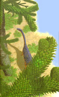 非洲南部的津巴布韦在2亿年前就是这样一种侏罗纪早期的景观。当时的津巴布韦几乎是一片不毛的沙漠,光秃秃的沙丘覆盖在许多地区。但是,各种植物--从矮小的蕨类到高大的针叶树,依然顽强地生长在这种严酷的环境中。当然,各种动物也在“万类霜天竞自由”,其中的主角当然是大大小小、各种各样的恐龙。长椎龙就是这些恐龙当中属于古脚类的一种。