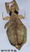 仿叶拟态的昆虫种类很多,其中著名的有竹节虫目,叶虫修科的一些种类,因为它们停息在植物上时很像植物叶片,所以人们通常叫它们叶子虫。叶子虫体扁平,雌虫前翅发达呈叶片状,翅脉明显,很像植物叶片的叶脉,后翅退化;雄虫前翅退化,后翅发达。 它们足宽扁,特别是前、中足腿节和胫节呈片状。体色多为绿色或褐色,跟所栖息生活环境中的植物叶片颜色相似,因而不易被天敌动物发现,得以逃避侵害。这类昆虫成虫不善飞翔,多生活在热带和亚热带地区,我国福建和南沙群岛可采集到。