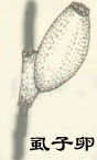 草蛉的卵,在卵下方有一根丝状长柄,长柄基部粘在植物叶 片上,将卵高高举起。卵粒在柄的顶端,呈白色或淡绿色。单个或数个产在一张叶片上,卵粒重而丝柄长,柄具弹性,微风吹来,随之摇摆,十分好看。